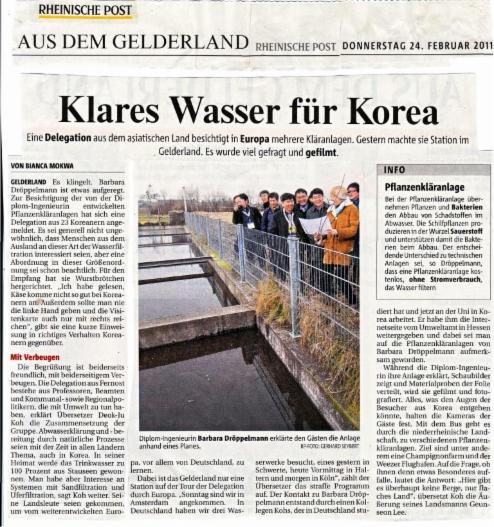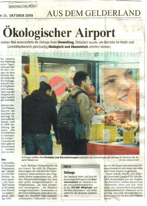 "Ökoloscher Airport Umwelttag der Dehoga:"Kläranlage Airport Weeze für 1000 EW, geplant 2004 von Dipl.Ing.B.Droeppelmann und erfolgreich in Betrieb seit 2005. Die Hoteliers und Gaststättenbetreiber auf der DEHOGA - Umweltmesse interessieren sich sehr für die ökonomischen Pflanzenkläranlagen... ". insbesondere für Hotelanlagen und Urbanisationen im Außenbereich." Erweiterung vorgesehen www.droeppelmann.comarbara.droeppelmann@arcor.de
